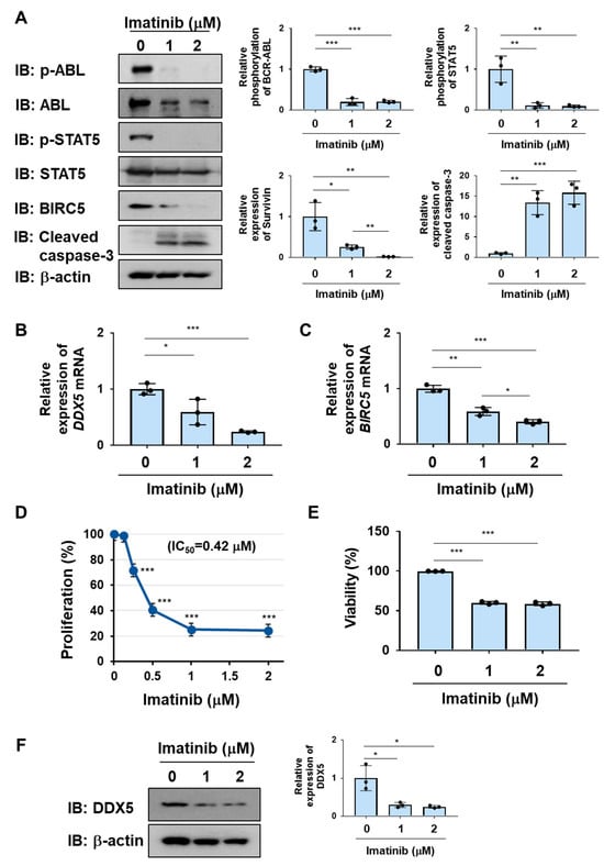 The treatment with imatinib reduces the expression of DDX5 in K562 cells. (A,B) K562 cells were treated with imatinib (1 and 2 μM) for 24 h. (A) The phosphorylation and/or expression levels of BCR-ABL, STAT5, BIRC5, and cleaved caspase-3 were examined by immunoblotting. The relative phosphorylation or expression of each protein is shown in the graphs. *, **, and *** indicate p < 0.05, p < 0.01, and p < 0.001, respectively. (B,C) The mRNA expression of DDX5 and BIRC5 was analyzed by RT-PCR. The mRNA expression level of β2-microglobulin was used as an internal control. *, **, and *** indicate p < 0.05, p < 0.01 and p < 0.001, respectively. (D) K562 cells (2 × 104 cells/100 μL) were treated with imatinib (0.125, 0.25, 0.5, 1, and 2 μM) for 48 h. Cell proliferation was assessed by the WST assay. *** indicates p < 0.001. (E) K562 cells (4 × 106 cells/4 mL) were treated with imatinib (1 and 2 μM) for 48 h. Cell viability was evaluated by the Trypan blue staining method. *** indicates p < 0.001. (F) The expression level of DDX5 was examined by immunoblotting and the relative expression of DDX5 is shown in the graph. * indicates p < 0.05.