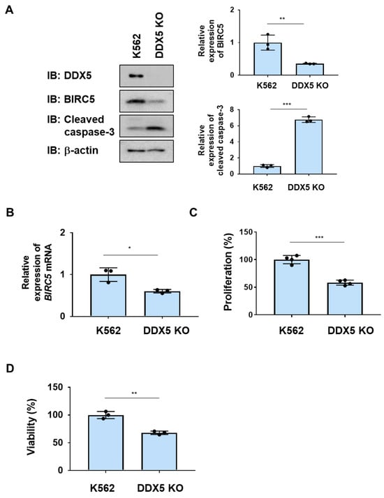 To examine the role of DDX5 in K562 cells, we generated K562 cells lacking DDX5 (DDX5-KO) using genome editing methods (Figure 2A). After control K562 cells and DDX5-KO cells were incubated without IL-3 for 24 h, the protein and mRNA expression of BIRC5 was significantly reduced in DDX5-KO cells (Figure 2A,B). The activation of caspase-3 was observed in DDX5-KO cells (Figure 2A). Furthermore, the proliferative ability and viability of DDX5-KO cells were significantly lower than those of control K562 cells (Figure 2B,C). These results suggest that DDX5 is an essential molecule for the proliferation and survival of K562 cells.