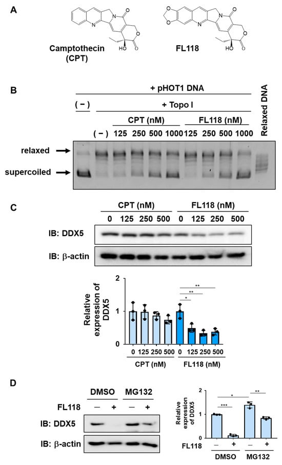 FL118 inhibits the activity of Topo I and suppresses the expression of DDX5. (A) The chemical structures of camptothecin (CPT) and FL118 are shown. (B) The effects of CPT and FL118 on Topo I activity were measured using recombinant Topo I and supercoiled DNA. After the reaction at 37 °C for 30 min, electrophoresis was performed using a 1% agarose gel. As a control, relaxed DNA was electrophoresed. (C) K562 cells were treated with CPT (125, 250, and 500 nM) or FL118 (125, 250, and 500 nM) for 24 h. Whole-cell lysates were prepared, the expression of DDX5 or β-actin was examined by immunoblotting, and the relative expression level of DDX5 is shown in the graph. * and ** indicate p < 0.05 and p < 0.01, respectively. (D) K562 cells were treated with FL118 (500 nM and DMSO (0.1%) or MG-132 (5 μM) for 12 h. Whole-cell lysates were prepared, the expression of DDX5 or β-actin was examined by immunoblotting, and the relative expression level of DDX5 is shown in the graph. *, **, and *** indicate p < 0.05, p < 0.01, and p < 0.001, respectively.
