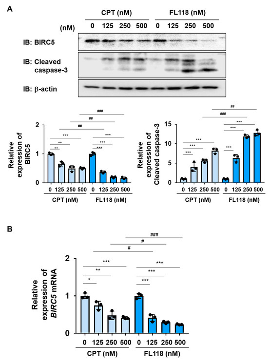 FL118 reduces the expression of BIRC5 and activates caspase-3 in K562 cells. (A,B) K562 cells were treated with CPT or FL118 at the indicated concentrations for 24 h. (A) Whole-cell lysates were prepared and the expression of BIRC5, cleaved caspase-3, or β-actin was examined by immunoblotting. The relative expression level of BIRC5 and cleaved caspase-3 is shown in the graphs. ** and *** indicate p < 0.01 and p < 0.001, respectively. ## and ### indicate p < 0.01 and p < 0.001, respectively. (B) The mRNA expression of BIRC5 was analyzed by RT-PCR. The mRNA expression level of β2-microglobulin was used as an internal control. *, **, and *** indicate p < 0.05, p < 0.01, and p < 0.001, respectively. # and ### indicate p < 0.05 and p < 0.001, respectively.