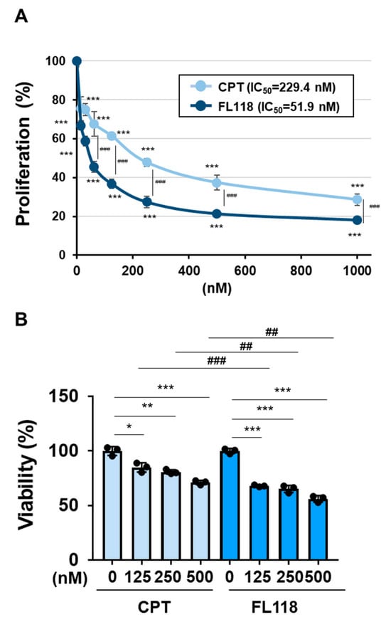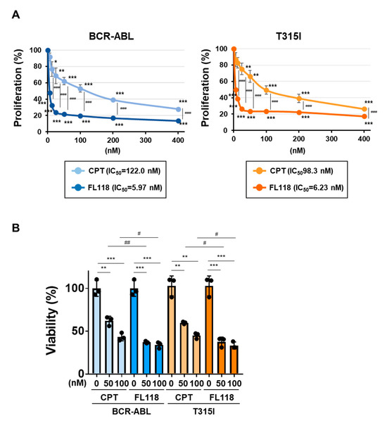 FL118 reduced cell proliferation and induced cell death more strongly than CPT in K562 cells. (A) K562 cells (2 × 104 cells/100 μL) were treated with CPT or FL118 at various concentrations for 48 h. Cell proliferation was assessed by WST assay. *** and ### indicate p < 0.001. (B) Transduced K562 cells (4 × 106 cells/4 mL) were treated with CPT (125, 250, and 500 nM) or FL118 (125, 250, and 500 nM) for 48 h. Cell viability was evaluated by the Trypan blue staining method. *, **, and *** indicate p < 0.05, p < 0.01, and p < 0.001, respectively. ## and ### indicate p < 0.01 and p < 0.001, respectively.