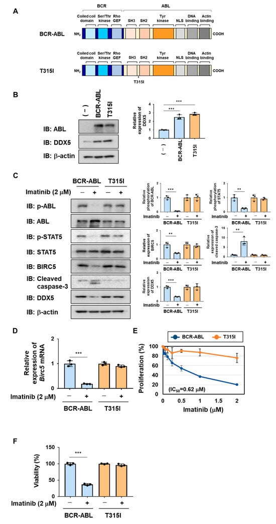 The BCR-ABL mutant harboring the T315I mutation shown in Figure 6A was previously reported to be resistant to BCR-ABL inhibitors [21,22]. We generated Ba/F3 cells expressing BCR-ABL and the BCR-ABL T315I mutant by retroviral infection and examined the expression of DDX5 in these cells. The enforced expression of BCR-ABL and BCR-ABL T315I mutant significantly increased the expression of DDX5 in Ba/F3 cells (Figure 6B). Then, we examined the sensitivities of these cells to imatinib. In Ba/F3 cells expressing BCR-ABL, the treatment with imatinib suppressed the phosphorylation of BCR-ABL and STAT5. Furthermore, in Ba/F3 cells expressing BCR-ABL, the treatment with imatinib reduced the protein and mRNA expression of BIRC5 and induced the cleavage of caspase-3. In contrast, in Ba/F3 cells expressing the BCR-ABL T315I mutant, the treatment with imatinib did not affect the phosphorylation of BCR-ABL or STAT5 or the protein or mRNA expression of BIRC5 and also did not induce the activation of caspase-3 (Figure 6C). The treatment with imatinib reduced the expression of DDX5 in Ba/F3 cells expressing BCR-ABL but did not affect the expression of DDX5 in Ba/F3 cells expressing the BCR-ABL T315I mutant (Figure 6D). The treatment with imatinib inhibited the proliferative ability of Ba/F3 cells expressing BCR-ABL in a concentration-dependent manner, with an IC50 of 0.62 μM. On the other hand, imatinib did not affect the proliferative ability of Ba/F3 cells expressing the BCR-ABL T315I mutant (Figure 6E). Furthermore, imatinib significantly decreased the viability of Ba/F3 cells expressing BCR-ABL but did not affect the viability of Ba/F3 cells expressing the BCR-ABL T315I mutant (Figure 6F).