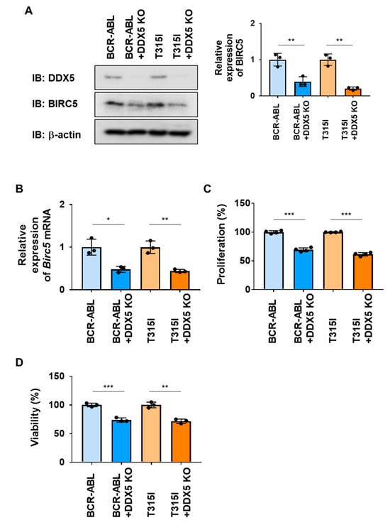We investigated the roles of DDX5 in Ba/F3 cells expressing BCR-ABL or the BCR-ABL T315I mutant by its deletion using genome editing methods. The expression of BIRC5 and Birc5 mRNA were significantly decreased by the knockout of DDX5 in both cells (Figure 7A). Under these conditions, the activation of caspase-3 was not detected. However, the proliferative ability and viability of both cells were significantly attenuated by the knockout of DDX5 (Figure 7B,C). These results suggest that the expression of DDX5 was induced not only by BCR-ABL, but also by the BCR-ABL T315I mutant, and that DDX5 was involved in cell proliferation and survival, even in CML cells resistant to BCR-ABL inhibitors.