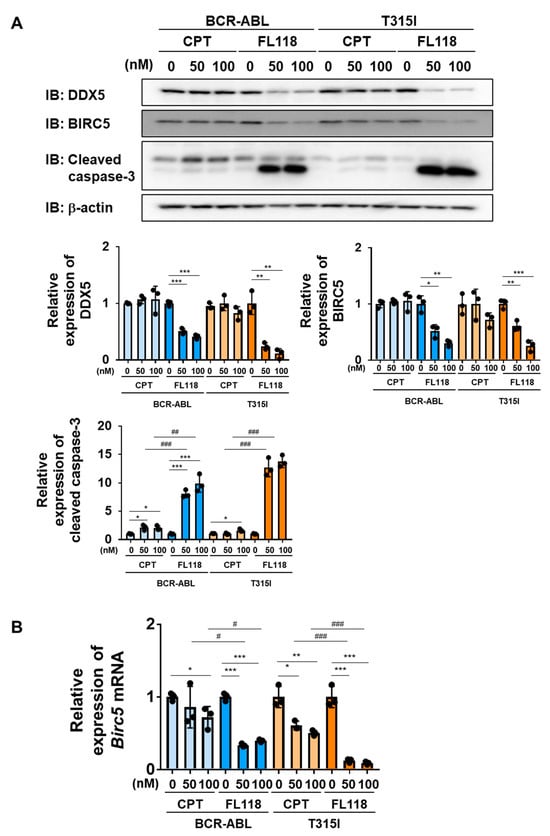 FL118 reduces the expression of BIRC5 and activates caspase-3 in Ba/F3 cells expressing BCR-ABL or the T315I mutant. (A,B) Ba/F3 cells expressing BCR-ABL or the T315I mutant were treated with CPT (50 and 100 nM) or FL118 (50 and 100 nM) for 24 h. (A) Whole-cell lysates were prepared and immunoblotting was performed. The relative expression levels of DDX5, BIRC5, and cleaved caspase-3 are shown in the graphs. *, **, and *** indicate p < 0.05, p < 0.01, and p < 0.001, respectively. ## and ### indicate p < 0.01 and p < 0.001, respectively. (B) The mRNA expression of Birc5 was analyzed by RT-PCR. The mRNA expression level of β2-microglobulin was used as an internal control. *, **, and *** indicate p < 0.05, p < 0.01, and p < 0.001, respectively. # and ### indicate p < 0.05 and p < 0.001, respectively.
