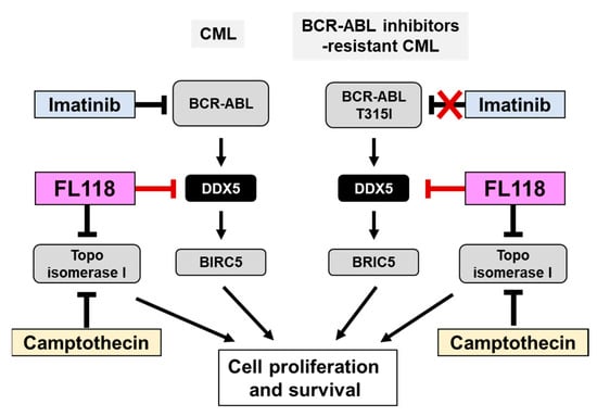 FL118, a DDX5 inhibitor, may be a novel therapeutic agent for CML that is resistant to BCR-ABL inhibitors. BCR-ABL promotes the proliferation and survival of CML cells by inducing the expression of DDX5. Due to the appearance of a point mutation (T315) in BCR-ABL during treatment with the BCR-ABL inhibitor imatinib, CML cells acquire resistance to BCR-ABL inhibitors. Similar to camptothecin (CPT), FL118 inhibits Topo I, but also suppresses the expression of DDX5. Therefore, FL118 has potential as a new treatment for CML that overcomes the drug resistance of CML cells expressing the BCR-ABL T315I mutation.