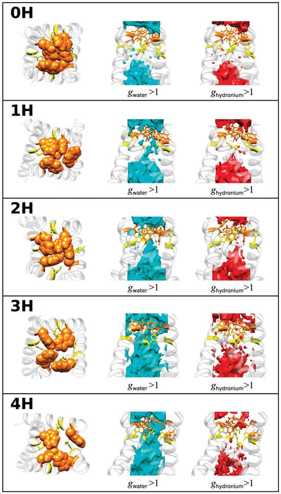 The first is the “closed” form of the channel in the 0H, 1H, and 2H states, since water distributions are not detected in the regions of His37 and the region with the Trp41 residues. In this case, the PMFs calculated by Equation (5) in Section 4 have high positive energetic barriers that water cannot overcome due to steric hindrance caused by both pores and solvent molecules. The situation is the same for hydronium ions, but with a lower distribution and higher barrier in PMFs compared to those of water, which indicates the impossibility of distributing hydronium ions (or protons) in the channel.