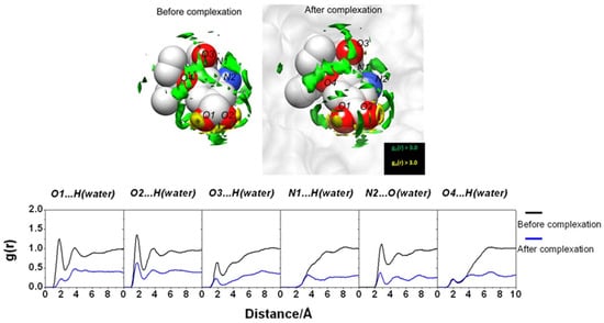(Upper) SDFs of water O (green) and H atoms (yellow) with g(r) > 4.0 within 7.0 Å of oseltamivir (depicted as blue mesh sphere). (Lower) The 3D-RISM RDF of hydrogen-bonded pairs between water molecules and five amino acid residues before and after complexation. Reprinted from Phanich et al. [], Copyright (2016), with permission from John Wiley & Sons, Inc.