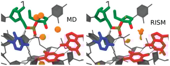 Na+ distribution functions (orange isosurfaces) from 3D-RISM calculations compared with peak positions (orange spheres) from MD simulations. Isosurfaces correspond to a concentration of 300 times the bulk (140 mM). Density more than 3 Å from the active-site residues was clipped for clarity. Adapted from Radak et al. [], Copyright (2015), with permission from Cold Spring Harbor Laboratory Press and the RNA Society.