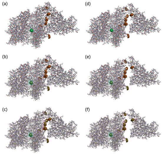 Isosurfaces of the 3D distribution of Na+ (brown) and Cl− (green) ions in solution around proteins SARS-CoV-2 and ACE2 (sticks) at a series of separations between them: (a) corresponding to the 0 Å distance, (b) 2 Å, (c) 4 Å, (d) 6 Å, (e) 8 Å, and (f) 10 Å. For both cases of ions, the isosurface values are 6.5. These values are close to their maximum for the current 3D-RISM solution, which means that they show the most probable positions of the respective solvent sites around the proteins. Reproduced from Kobryn et al. [], Copyright (2021), with permission from the Centre National de la Recherche Scientifique (CNRS) and the Royal Society of Chemistry.