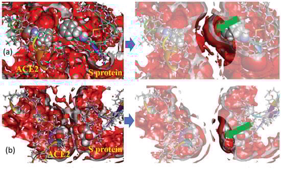 In addition to the designated interactions, hydrophobic interactions as well as salt bridges also contribute to binding affinity []. This aspect was also considered in []. First, for a series of protein separations, the authors [] analyzed the 3D distribution of water oxygen atoms around selected pairs of amino acids of the S and hACE2 proteins (TYR83 from hACE2 and PHE486 from S as well as GLY326 from hACE2 and THR500 from S), which participate in hydrophobic interactions. The presented SDFs indicate almost full absence of the first hydration shell between interacting amino acids in the case of a separation of 0 Å (Figure 7a), which is evidence for an effect of excluded volume at short distances. At the same time, the hydration layer is clearly visible in SDFs at a separation of 4 Å (Figure 7b), that is an indication of water penetration into the cavity between the amino acid residues. The depleted region of water density at the surface was explained by the hydrophobic effect, i.e., the above hydrophobic residues are isolated from water due to the unfavorable solvation of nonpolar groups, thereby minimizing the surface exposed to solvent. Next, the authors calculated SFE and PMF for a series of separation distances (from 0 to 14 Å) between SARS-CoV-2 and hACE2. The obtained dependencies demonstrated the following features. SFE has a broad minimum (about –30 kcal/mol) at short separations (up to 4 Å), which is indicative of hydrophobic hydration playing an essential role in the protein–protein binding. At the same time, PMF exhibits a downslope shape with a deep minimum (less than −200 kcal/mol) at a separation of 0 Å, which reflects the intensity of binding between proteins.
