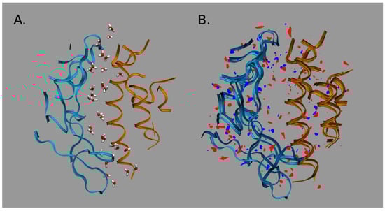 Water distribution in the interfacial region of complexes: (A) For the CoV-2–hACE2 complex. (B) Differences in distributions of water oxygens (blue color) and water hydrogens (red color) between the CoV-2–hACE2 and CoV–hACE2 complexes. The RBD is indicated by blue ribbons, the hACE2 by orange ribbons, and the CoV–hACE2 is shown as background for the differences. Reproduced from Kumawat et al. [], Copyright (2022), with permission from MDPI.