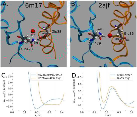 Moreover, according to the 3D-RISM results, the interactions of the solvent with the complex are stronger than even with the pure virus. This effect is confirmed by the calculated protein–solvent interaction energies when the total interaction energy has a greater gain for the SARS-CoV-2–hACE2 complex due to the significant reduction in electrostatic (the Coulomb) energy (see Table 1 in Ref. [] for details). The authors explained this effect by the stronger polarization of interfacial water in the case of the SARS-CoV-2–hACE2 complex. They also found that the SARS-CoV-2–hACE2 complex forms water bridges which are more stable in comparison with those of SARS-CoV–hACE2, which is confirmed by the values of 3D-RISM PMFs (Equation (5) in Section 4) between the RBD and hACE2 atoms (Figure 9). As one can see from Figure 9, a bridging water molecule is able to simultaneously form H-bonds with the Gln493 residue of SARS-CoV-2 and the Glu35 residue of hACE2. At the same time, for the SARS-CoV–hACE2 complex, the H-bond formed by bridging water is rather weak and diffusive (Figure 9). Thus, as the authors of [] conclude, bridging water molecules may significantly contribute to the stabilization of the SARS-CoV-2–hACE2 complex.