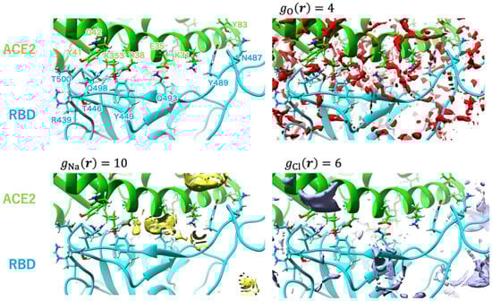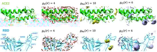 Kobryn et al. [] investigated the role of solvation in RBD–hACE2 binding. To this end, they considered a system where the solute is the SARS-CoV-2–hACE2 complex, while the solvent contains water molecules, ions (Na+ and Cl−), and dissolved drug-like molecules (small organic molecules of the types of N-acetyl-*D*-glucosamine, NAG). The RBD–ACE2 complex structure was optimized based on the experimentally observed structure (PDB id: 6LZG). The obtained results were discussed by analyzing the 3D hydration shells of complexes and a trend for such thermodynamic quantities as SFE and PMF obtained by Equations (5) and (6) (see Section 4). The authors [] studied the details of the 3D distributions of water oxygens and NAG nitrogen, as well as Na+ and Cl− ions in solution around the SARS-CoV-2–hACE2 complex at different separations between proteins (0, 2, 4, 6, 8, and 10 Å). As found from these SDFs, irrespective of the protein separation, waters are oriented toward specific interaction sites of both proteins, while the NAG molecule is localized mostly in the area of the contact of protein surfaces, preferring to remain near the hACE2 receptor. The latter observation indicates the absence of any strong interaction between the drug-like molecule and the S protein. At the same time, Cl− ions are located inside the hACE2 structure, and Na+ ions are predominantly arranged in the vicinity of the protein surfaces during their contact and separation (Figure 6). This detected localization of positively charged ions near the contacting surfaces of proteins in complex and water molecules near specific protein interaction sites is the result of, respectively, electrostatic interaction and H-bonding of the above solvent components with proteins. As was later established (see, for instance, []), these interactions play an essential role in the process of recognition of the hACE2 receptor by the virus spike protein and in stabilizing the RBD–hACE2 complex (see also the further review of the article []).