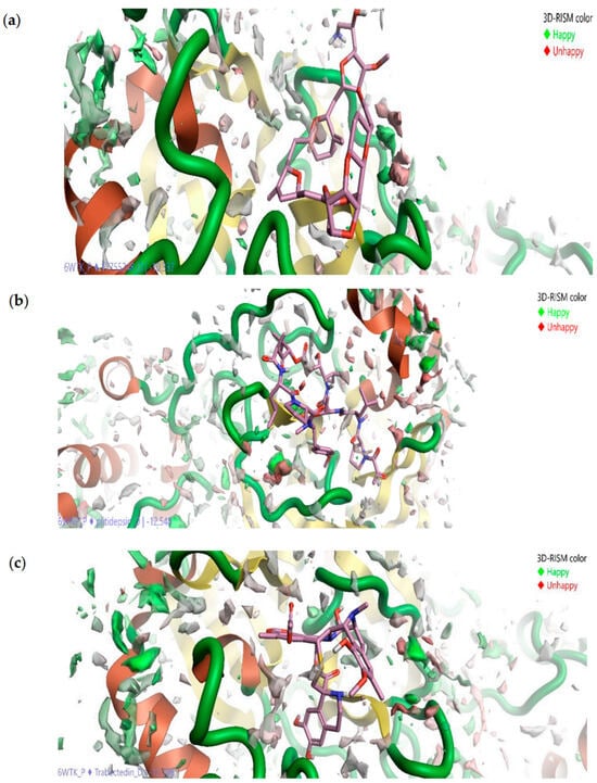 Three-dimensional distribution of water oxygens around ligand–protein complex: Eribulin mesylate–Mpro (a), Plitidepsin–Mpro (b), and Trabectedin–Mpro (c). The oxygen distribution in green and red colors indicates, respectively, favorable and unfavorable location of water at the active site of Mpro. Reproduced from Kalhotra et al. [], Copyright (2021), with permission from MDPI.