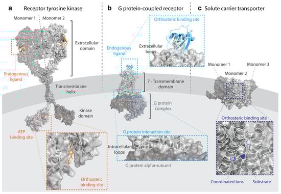 Crystallization itself is more difficult for membrane proteins, particularly due to the protein instability outside of the membrane. This means that additional measures are needed, such as the addition of stabilizing molecules, or the construction of protein orthologues, which in turn reduce the throughput of structural characterization []. While X-ray crystallization has been the classical method to determine the structure of membrane proteins, cryo-EM has been on the rise, allowing near-native structural determination with resolutions that have vastly increased in recent years []. The aforementioned challenges do not equally apply to the protein classes that are reviewed here, as demonstrated by their structural coverage. At the time of writing this review, over 2000 structures were available for 41 out of 58 human RTKs, although in most cases, they only represent the soluble kinase domain []. Moreover, 187 out of the 826 GPCRs in the human genome have been structurally determined with a total of 1160 receptor structures in different conformations []. However, due to their dynamic nature, under 5% of human SLC protein structures are available—although the number is rapidly increasing thanks to cryo-EM structures []. Computational tools, and in particular AlphaFold, are increasingly expanding the availability of good-quality predicted protein structures, although this task is less accurate for protein families with fewer structures available for training, which is the case for membrane proteins [].