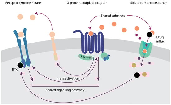 The fact that proteins do not exist in isolation is one of the most difficult aspects to tackle in cancer research. In turn, crosstalk between proteins can lead to compensation mechanisms, synergistic effects, and therapy resistance. Protein interplay has been extensively characterized for different members of the same family, for example, triggering synergy by co-expression in SLCs [], or the activation of compensatory networks by RTKs as a mechanism of drug resistance []. However, the crosstalk can also happen with members from other membrane protein families (Figure 4), which in turn opens opportunities for novel therapeutic avenues that can further be explored computationally.