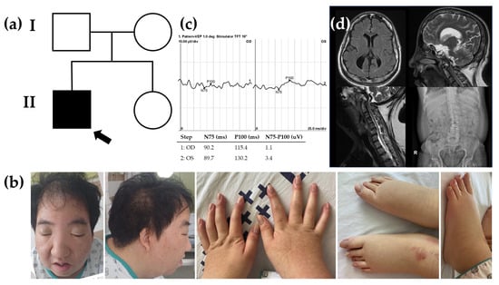 Pedigree, clinical phenotypes, and radiologic findings. (a) Pedigree of the proband (arrow) carrying a heterozygous TRAF7 variant in an autosomal dominant inheritance and his family members. (b) Short stature (153.7 cm), short neck, humped back, excess nuchal skin, facial dysmorphism (swollen eyelids, blepharophimosis), arachnodactyly, and edema in both lower extremities. (c) Visual evoked potentials recorded in 2-year-old showing small amplitude VEP in both eyes. (d) Diffuse atrophy and skull bone thickening on brain magnetic resonance imaging (MRI). On cervical MRI, severe angulation of the craniocervical junction and spinal cord compression. L-spine scoliosis.