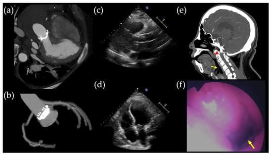 Postoperative radiologic findings. (a,b) Coronary artery computed tomography performed on postoperative day (POD) 32 illustrates the successful Bentall operation, which included aortic valve replacement (21 mm), ascending aorta replacement, and coronary button implantation. (c,d) Transthoracic echocardiogram conducted on POD 32 revealed unchanged right ventricular dilatation in size compared to the preoperative transthoracic echocardiogram. Facial CT scan (e) and laryngoscopy (f) identified narrowing of the nasopharynx and oropharynx due to a retropositioned mandible, with the epiglottis indicated by the yellow arrow and the uvula by the red arrowhead.