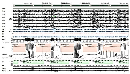 Polysomnogram results indicated severe OSA syndrome with an apnea hypopnea index (AHI) of 88/hour, respiratory disturbance index (RDI) of 88/hour, and nadir oxygen saturation of 74% (Figure 4).