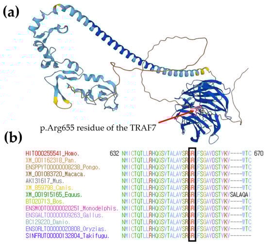 Protein structure and conservation analysis. (a) Protein structure analysis using AlphaFold showed very high per-residue confidence scores (pLDDT) of 88.5 for TRAF7 p.Arg655 residue, highlighted in pink and indicated by a red arrow. (b) Sequence alignment of the conserved cytoplasmic domain of the TRAF7 protein in multiple vertebrate species. Protein sequence of the p.Arg655 residue is highly conserved between all multiple vertebral species. It is highlighted in the empty black box.