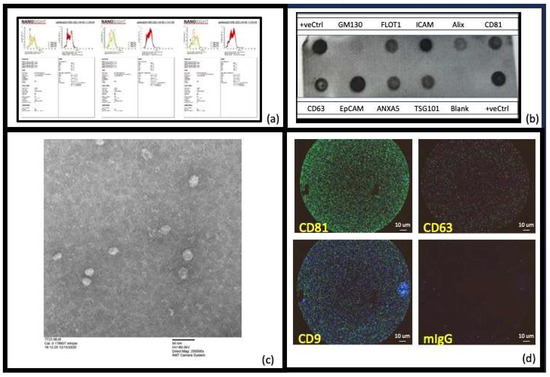 Characterization of the extracellular vesicles (EVs) isolated: (a) Nanosight (NTA) (NS300 Malvern Analytics) analysis was used to assess the size and concentration of the vesicles [57] and showed that the size of the EVs varied per participant, but all were in the range expected for EVs that comprised both exosomes (30–150 nm) and microvesicles (50–450 nm). Due to this participant-dependent variation in the amount of exosomes present, we have chosen to use the term “extracellular vesicles (EVs)” to include all particles isolated and studied in this work. (b) The Exo-Check Exosome Antibody arrays (Systems Biosciences EXORAY200B-4) have 12 total printed antibody spots, 8 of these are for known exosome markers (CD63, CD81, TSG101, Alix, FLOT1, EpCAM, ICAM1, and ANXA5). The other four comprised a GM130 spot to test for any contaminating cis-Golgi, with a positive control at either end of the blot to check the HRP detection is working, and a blank spot which should yield no signal. As can be seen, when our isolated EVs were incubated with these blots (after the proprietary EV labeling and detection was performed according to the manufacturer’s instructions), the exosome positive markers and the positive controls were strongly positive, the blank was negative and the negative control (GM130) had negligible signal. This confirmed that the EVs prepared using precipitation were extracellular vesicles that included exosomes. (c) Negative-staining transmission electron microscopy, a dehydrating technique summarized in Section 4 [58], indicated the primary presence of smaller EVs (~30–50 nm). (d) Exoview analysis allowed us to assess the presence of tetraspanins to determine if exosomes had been isolated (Unchained labs: 251-1044). The three most reported exosome tetraspanins, CD63, CD81, and CD9, were present in our healthy human control plasma EVS indicating the presence of exosomes.