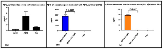 To determine binding of EVs to Aβ42 or Aβ40 we used a SIMOA-based analysis (Figure 2). EVs derived from control human plasma samples (controls) (n = 5) were found to have on average 0.4, 5, and 1.2 pg/mL of Aβ42, Aβ40, and Tau, respectively (Figure 2A). Overnight incubation of control human plasma-derived EVs (n = 3), with a final concentration of monomeric 0.015 μM Aβ42, Aβ40, or scrambled peptides and post-incubation SIMOA analysis displayed elevated levels of peptide: 142.68 pg/mL and 550.73 pg/mL for Aβ42 and Aβ40, respectively. The observation that little to no Aβ40 (0 pg/mL) or Aβ42 (1.1 pg/mL) were detected when scrambled versions of the peptides were incubated with the EVs implies that these peptides do not act as mimics for Aβ40 or Aβ42 (Figure 2B,C). Performing the EVs precipitation isolation steps with Aβ alone (no EVs) did not provide any measurable Aβ.