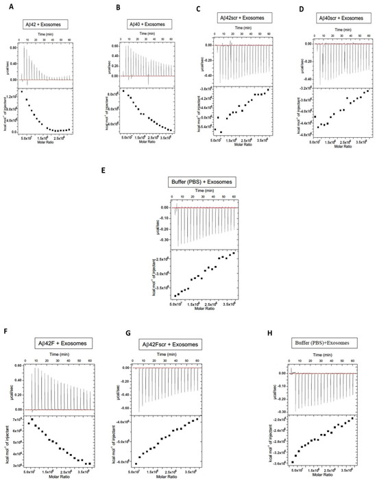 Aβ binds to extracellular vesicles in an endothermic and saturable manner. To assess the specificity of binding of Aβ40 and Aβ42 and their scrambled versions with extracellular vesicles (EVs), we utilized isothermal titration calorimetry (ITC). EVs were titrated into a solution containing one of the various types and forms of Aβ peptides: Aβ42 (A), Aβ40 (B), Aβ42scrambled (Aβ42scr) (C), Aβ40scrambled (Aβ40scr) (D), buffer alone (E), Aβ42Fibrillar (Aβ42F) (F), Aβ42Fibrillar scrambled (Aβ42Fscr) (G), and buffer alone for the fibrillar (F) assay (H). Supplemental Figure S2 shows repeats of these experiments, i.e., using control healthy plasma exosomes from three other subjects.