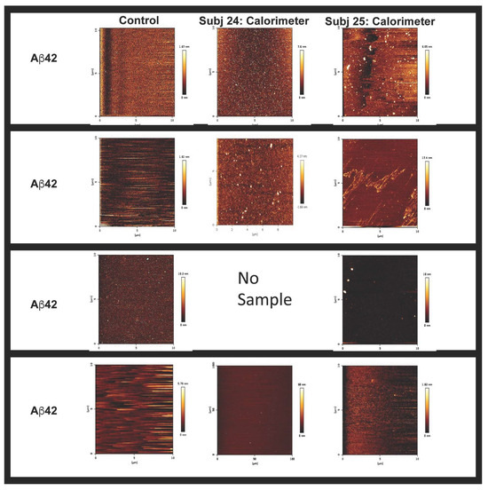 Calorimeter contents, post ITC, containing mainly non-fibrillar forms of Aβ. Examination of the calorimeter contents and peptides utilized for the assay by AFM displayed non-fibrillar forms of Aβ as being present in solution. Given that we did not have Subject 24’s Aβ40, we could not assess this sample using AFM.