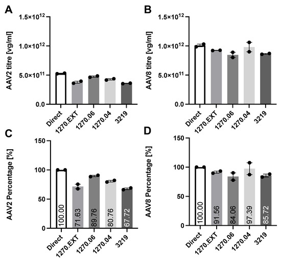 Retention of AAV Serotype 2 and of AAV Serotype 8 within the D.O.R.C. 1270.EXT, 1270.06, 1270.04, and the MedOne 3219 cannula. Absolute titers of two repeated experiments given as the average of each sample measured in two concentrations and technical triplicates on top (A,B), percentages of the direct measurement shown below (C,D).