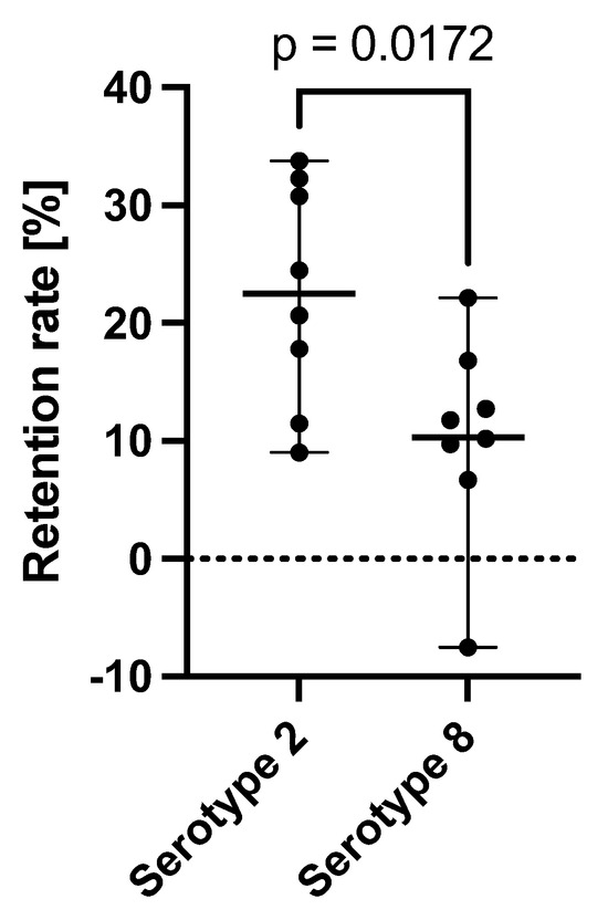 For the statistical analysis, Prism 10 for Macintosh, Version 10.1.1(270), 21 November 2023 was used. Descriptive statistics were used to summarize the data. An unpaired two-sided T test was performed to compare the retention rates between the serotypes. Continuous data is given as the mean ± SD. A p value of < 0.05 was considered statistically significant.