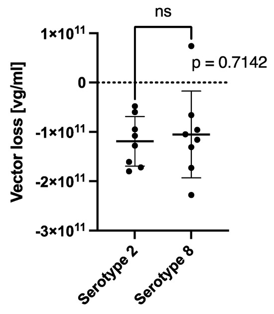 The retention rate and the effect of the PF68 surfactant in earlier studies was shown to be less pronounced for the AAV8 serotype [12]. Here, we have also found slight differences between the AAV2 and the AAV8 serotype. While the retention of VN was, on average (all injections systems combined), 22.5% (±9.4), the average retention of the AAV8-based IND was only 10.3% (±8.6) (p = 0.017, Figure 2). The absolute number of mean vector genome copies lost within all injection systems was not significantly different between the two vectors (Figure 3). An explanation for this could be the higher concentration of the AAV8-based IND (1 × 1012 vg/mL) compared to Luxturna (5 × 1011 vg/mL) and a possible saturation effect of AAV vector loss within the cannulas. Alternatively, a difference in retention rate between serotypes can also be related to a different capsid surface structure that dictates binding properties [17,18,19].