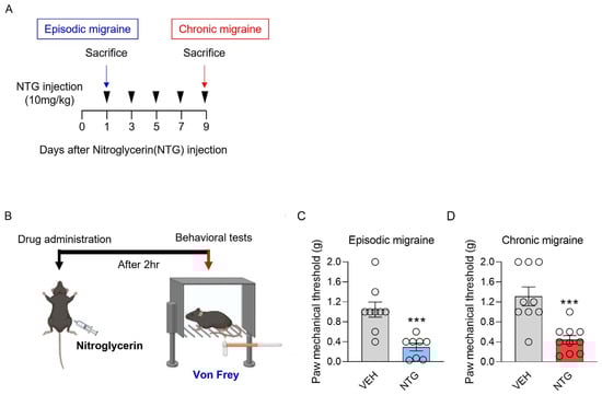 (A) Experimental protocols to establish mouse models of episodic and chronic NTG-induced migraine (EM and CM, respectively). (B–D) Experimental measurement of mechanical hypersensitivity using the von Frey filament test. (C) Non-parametric analysis (Mann–Whitney test) and (D) Parametric analysis (Unpaired t-test): *** p < 0.001. Abbreviations: NTG, nitroglycerin; VEH, vehicle control.