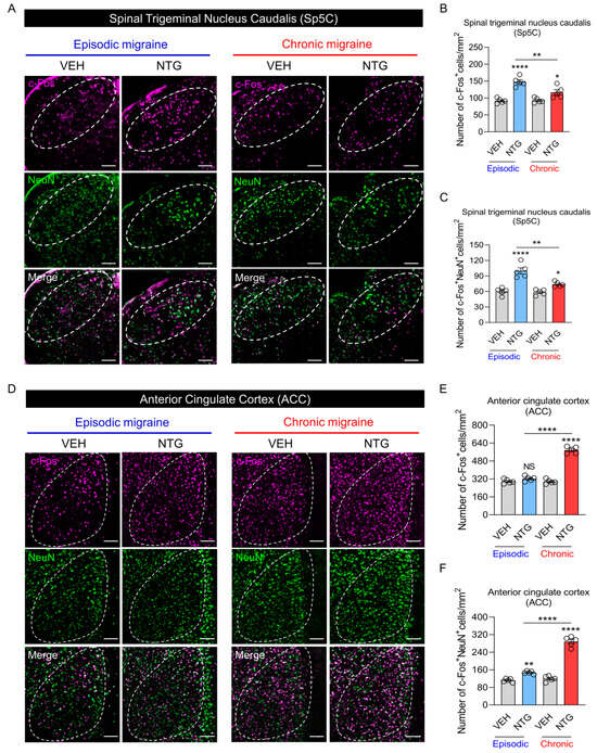 c-Fos and NeuN expression patterns in mouse models of episodic and chronic NTG-induced migraine (EM and CM, respectively). (A) Representative images of c-Fos (red) and NeuN (green) immunofluorescence staining in the Sp5C of EM and CM models. Scale bars = 10 μm. (B) Numbers of c-Fos+ cells/mm2 in the Sp5C of EM and CM mouse models. (C) Numbers of c-Fos+NeuN+ cells/mm2 in the Sp5C of EM and CM mouse models. (D) Representative images of c-Fos (red) and NeuN (green) immunofluorescence staining in the ACC of EM and CM mouse models. Scale bars = 10 μm. (E) Numbers of c-Fos+ cells/mm2 in the ACC of EM and CM mouse models. (F) Numbers of c-Fos+NeuN+ cells/mm2 in the ACC of EM and CM mouse models. One-way ANOVA with post hoc Tukey test: * p < 0.05; ** p < 0.01; **** p < 0.0001; ns, not significant. Abbreviations: ACC, anterior cingulate cortex; NTG, nitroglycerin; Sp5C, spinal trigeminal nucleus caudalis; and VEH, vehicle control.