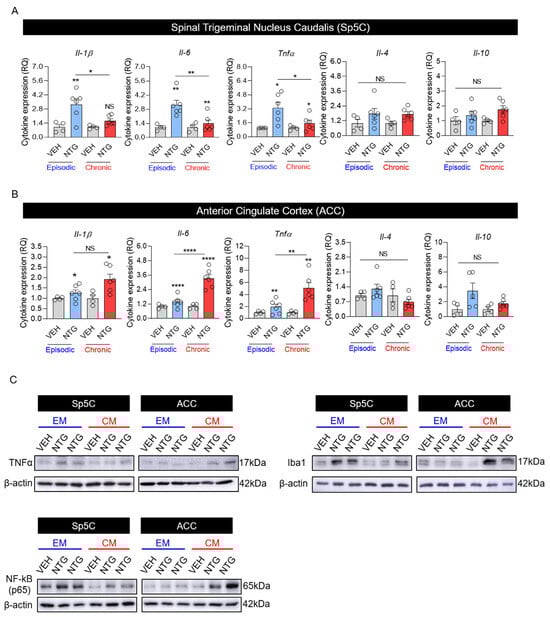 Inflammatory marker expression patterns in mouse models of episodic and chronic NTG-induced migraine (EM and CM, respectively). (A) Cytokine expression in the Sp5C of EM and CM mouse models, as determined using qRT-PCR. (B) Cytokine expression in the ACC of EM and CM mouse models, as determined using qRT-PCR. (C). TNF-α, Iba1, NF-κB, and β-actin (control) protein bands and relative expression, as determined using immunoblotting. Statistical analysis was conducted using the Kruskal–Wallis test with Dunn’s multiple comparisons test and one-way ANOVA with the post hoc Tukey test. * p < 0.05; ** p < 0.01; **** p < 0.0001; ns, not significant. Abbreviations: ACC, anterior cingulate cortex; NTG, nitroglycerin; Sp5C, spinal trigeminal nucleus caudalis; VEH, vehicle control.