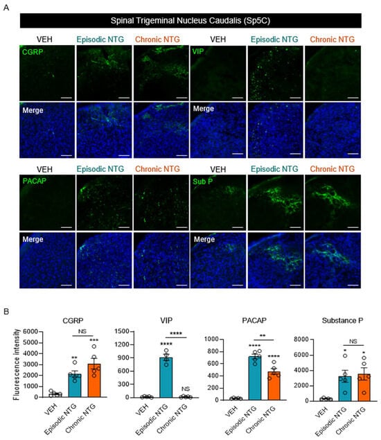 Neuropeptide expression patterns in the Sp5C in mouse models of episodic and chronic NTG-induced migraine (EM and CM, respectively). (A) Representative images of VIP, CGRP, PACAP, and substance P (green) immunofluorescence staining in the Sp5C of EM and CM mouse models. In the merged results, DAPI was added along with the VIP, CGRP, PACAP, and substance P markers. Scale bars = 20 μm. (B) Fluorescence intensities of VIP, CGRP, PACAP, and substance P in the Sp5C of EM and CM mouse models. One-way ANOVA with post hoc Tukey test: * p < 0.05; ** p < 0.01; *** p < 0.001; **** p < 0.0001. ns, not significant.