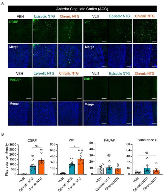 Neuropeptide expression patterns in the ACC in mouse models of episodic and chronic NTG-induced migraine (EM and CM, respectively). (A) Representative images of VIP, CGRP, PACAP, and substance P (green) immunofluorescence staining in the ACC of EM and CM mouse models. In the merged results, DAPI was added along with the VIP, CGRP, PACAP, and substance P markers. Scale bars = 20 μm. (B) Fluorescence intensities of VIP, CGRP, PACAP, and substance P in the ACC of EM and CM mouse models. Statistical analysis was conducted using the Kruskal–Wallis test with Dunn’s multiple comparisons test and one-way ANOVA with post hoc Tukey test: * p < 0.05; ** p < 0.01; **** p < 0.0001; ns, not significant. Abbreviations: ACC, anterior cingulate cortex; CGRP, calcitonin gene-related peptide; NTG, nitroglycerin; PACAP, pituitary adenylate cyclase-activating peptide; VEH, vehicle control; VIP, vasoactive intestinal peptide.