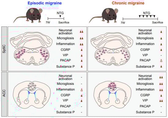 Summary of differences in neuropathology in the Sp5C and ACC between mouse models of episodic and chronic NTG-induced migraine (EM and CM, respectively). (-); ns, not significant, White triangle; slightly increase, Red triangle; significantly increase.