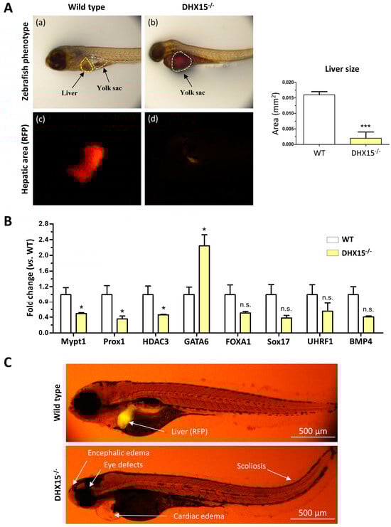 As we and others previously described, Dhx15 deficiency in zebrafish embryos depicts phenotypic abnormalities and ultimately results in lethality at day 8 post-fertilization (dpf). Such mutant embryos are characterized by encephalic and cardiac edema, scoliosis, impaired neural/eye growth. and defective pectoral fin and jaw development [,]. To determine whether Dhx15 gene deficiency is also associated with liver organogenesis, we generated a Dhx15 knockout zebrafish model in a red fluorescent protein (RFP) background under the liver-specific promoter fab10. At 5 dpf, Dhx15−/− embryos presented evident differences from their wild-type (WT) clutch-mates; at this stage, mutant embryos lack livers (Figure 1A). By means of fluorescent microscopy, we specifically visualized the hepatic area marked with RFP in zebrafish embryos, and we detected residual or no staining tissue in Dhx15−/− embryos (Figure 1A, panels c and d). We also determined the percentage of hepatic yolk retention. Dhx15−/− embryos depicted a 100% yolk retention; in contrast, WT clutch-mates presented a 0–5% yolk retention. This observation suggests that the lack of liver tissue in Dhx15−/− embryos may be the mechanism responsible for yolk retention due to impaired nutrient metabolism, causing metabolite accumulation in the yolk sac (Figure 1A, panel b). Heterozygous embryos were also evaluated and displayed similar characteristics as WT embryos, indicating no evident alterations in heterozygosis (Supplementary Figure S1).