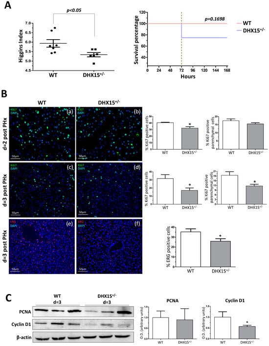 To study the role of Dhx15 during regeneration, we performed two-thirds partial hepatectomy (PHx) in WT and Dhx15+/− mice. Mice were sacrificed at 2, 3, and 7 days post-PHx; the wet remnant liver weight together with the total body weight was used to calculate the hepatic regenerative rate known as Higgins Index. Seven days after PHx, Dhx15+/− mice showed decreased regenerative rate associated with a trend of increasing mortality at 72 h after surgery compared with WT mice (Figure 3A), although these differences were not significant.