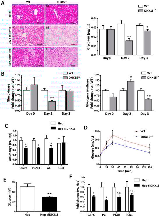 After partial hepatectomy, glycogen storage is used to feed the highly metabolic demand of liver regeneration, finding its lowest peak at 24 h post-PHx, to later recover its normal levels [,]. To elucidate whether the defects in regeneration were related to metabolic alterations restricting the energetic demands in the liver, we first quantified glycogen levels in the regenerating livers of our Dhx15-deficient animal experimental model. We observed a significant decrease in glycogen in Dhx15+/− mice two and three days after PHx compared to WT (Figure 4A), indicating that heterozygous mice are unable to normalize glycogen levels post-PHx. We analyzed the expression of glucokinase (Gck), which converts glucose into glucose 6-phosphate, and the expression of glycogen synthase (Gs) which converts UDP-glucose into glycogen, before and after hepatectomy (Figure 4B). We observed that after hepatectomy, Dhx15+/− mice showed significantly lower levels of Gck at day 2, returning to basal levels at day 3. On the other hand, the Gs gene showed differential expression in the context of Dhx15 deficiency with overexpression on day two and gene repression on day three, compared to the wild-type group. Although Gs does not exhibit a defined tendency of differential expression, its consistent transcriptional deregulation together with the differential expression of Gck are concordant with the differences found in glycogen accumulation between the wild-type and the Dhx15+/− groups at different time points (Figure 4A). This may indicate that the deficiency of the Dhx15 helicase is altering the expression of Gck and that Gs expression increases in order to compensate such enzymatic deficiency; however, it is not able to properly restore the glycogen storage levels. Accordingly, in Dhx15 silenced hepatocytes (Hep-siDhx15), we evaluated genes participating in glycogenesis and found lower RNA expression of Phosphoglucomutase 1 and Udp-glucose pyrophosphorylase that participate in the conversion of glucose into glycogen (Figure 4C).