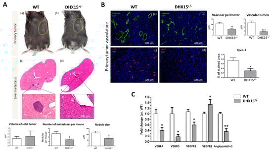 To better analyze lymphatic defects, we quantified the RNA expression of several vascular factors within the primary tumor. We analyzed the expression of Vegf-d which participates in lymphangiogenesis and in endothelial cell growth, being relevant in the development of new lymphatic vasculature in metastasis []. We found a significant decrease in Vegf-d and a significant upregulation of its receptor Vegfr3 in the primary tumors of Dhx15+/− mice. We also found a significant decreased expression of Vegf-a, Vegfr1, its receptor, and angiopoietin 1, in the primary tumors of Dhx15+/− mice (Figure 5C). The results suggest that the fewer hepatic tumor nodules observed in Dhx15+/− mice might be due to an impaired growth and development of the vascular network in the primary tumor.
