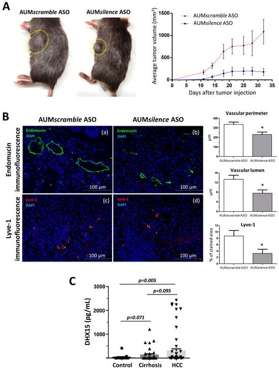 Tumor growth in wild-type mice following Hepa1-6 tumor induction after Dhx15 inhibition. (A) On the left, macroscopic images of tumor size in wild-type AUMscramble ASO (scramble) and AUMsilence ASO (Dhx15 specific)-injected mice 5 weeks after mouse Hepa1-6 hepatoma cells implantation. Yellow circles delimitate primary tumor localization. On the right, the graph shows tumor growth in wild-type AUMsilence ASO (Dhx15-specific) or AUMscramble ASO (scramble)-injected mice. Tumor volume was monitored every 3 days until the end of the study. (B) Immunostaining of intratumoral vessels (blood vessels stained with endomucin, panels a and b, and lymphatic vessels stained with anti-Lyve-1 antibody, panels c and d) in wild-type AUMsilence ASO (Dhx15-specific) or AUMscramble-ASO (scramble)-injected mice. Quantifications of total vascular perimeter and lumen of all intratumoral blood vessels, and percentage of Lyve-1-positive immunostaining are shown in the right graph. Bars represent mean ± SEM, * p < 0.05 vs. wild-type mice (n = 10 animals for each condition). Original magnification: 200×. (C) DHX15 levels in the serum of patients with cirrhosis (n = 35), hepatocellular carcinoma (n = 62), and healthy controls (n = 24).