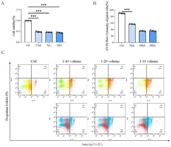 CP-BHI induced the death of macrophages. (A) The cell viability of THP-1 cells treated with different concentrations of CP-BHI for 8 h was analyzed by the CCK-8 test. The control cells were calibrated as 100%. (B,C) FACS detection of Annexin-V/PI analysis of THP-1 cells treated with different concentrations of CP-BHI for 8 h. p < 0.001 *** indicates statistically significant differences.