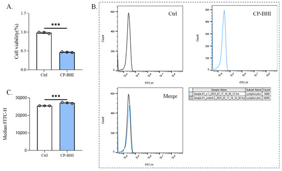 CP-BHI induced ROS production in macrophages. (A) The cell viability of THP-1 cells treated with 1/40 volume of CP-BHI for 8 h was analyzed by the CCK-8 test. The control cells were calibrated as 100%. (B,C) FACS detection of ROS analysis of THP-1 cells treated with 1/40 volume of CP-BHI for 8 h; the three “diagram of curves” belong to Figure 2B. p < 0.001 *** indicates statistically significant differences.