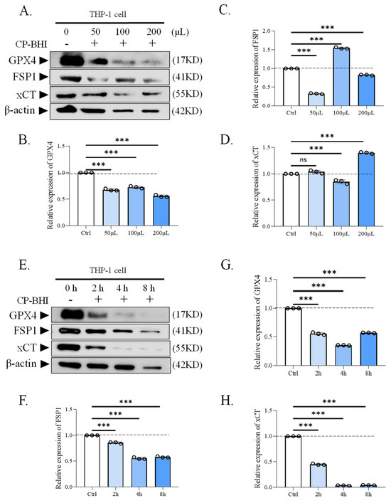 CP-BHI decreased the expression of antioxidant-related factors in macrophages. (A) The expression of antioxidant-related factors in THP-1 cells treated with different concentrations of CP-BHI was analyzed by Western blotting. (B,G) The semi-quantification of GPX4. (C,F) The semi-quantification of FSP1. (D,H) The semi-quantification of xCT. (E) The representative blots of cells treated with CP-BHI for different times. (I) Representative immunofluorescence images of GPX4. (J) Representative immunofluorescence images of FSP1. p < 0.001 *** indicates statistically significant differences, and ns indicates no significant difference.
