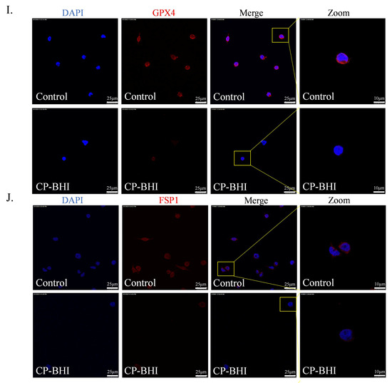 To investigate whether CP-BHI led to the collapse of the antioxidant system through the accumulation of ROS, the expression of antioxidant-related factors was analyzed, such as antioxidant factors glutathione peroxidase 4/ferroptosis-suppressor-protein 1/the cystine/glutamate antiporter solute carrier family 7 member 11 (GPX4/FSP1/xCT). The results of western blotting (Figure 3A–H) and immunofluorescent staining assay (Figure 3I,J) demonstrated a decrease in antioxidant-related factors in macrophages treated with CP-BHI. These data indicated that CP-BHI induced the collapse of the pro-/antioxidant balance through the excessive accumulation of ROS.