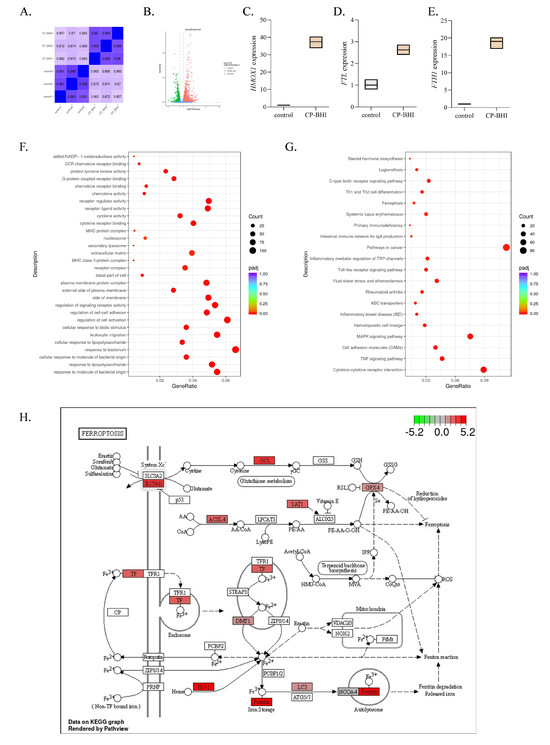 CP-BHI could induce ferroptosis in THP-1 cells. (A) The heat map of correlation between samples. (B) Volcanic map. (C) The expression of HO-1. (D) The expression of FTL. (E) The expression of FTH1. (F) GO database annotation of DEGs. (G) KEGG enrichment analysis of DEGs. (H) The plot of KEGG.
