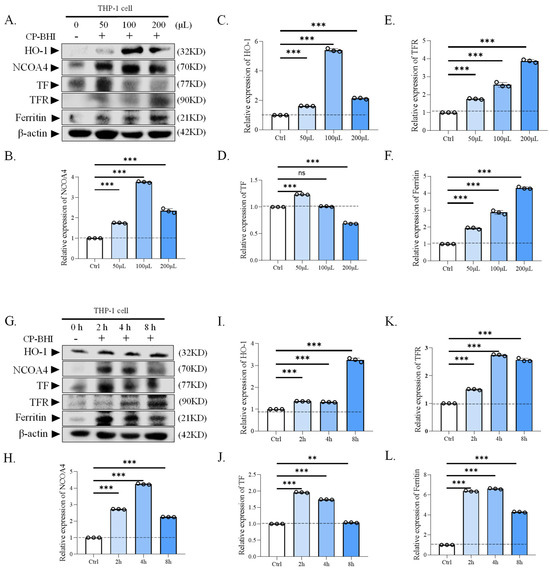 CP-BHI increased the expression of ferroptosis-related protein in macrophages. (A) The expression of ferroptosis-related protein in THP-1 cells treated with different concentrations of CP-BHI was analyzed by western blotting. (B,H) The semi-quantification of NCOA4. (C,I) The semi-quantification of HO-1. (D,J) The semi-quantification of TF. (E,K) The semi-quantification of TFR. (F,L) The semi-quantification of ferritin. (G) The representative blots of cells treated with CP-BHI for different times. p < 0.01 **, p < 0.001 *** indicates statistically significant differences, and ns indicates no significant difference.