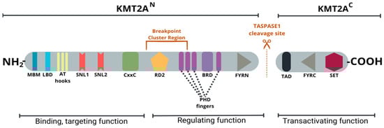 Wild-type KMT2A domain structure. Proteolytic cleavage of the KMT2A molecule by enzyme TASPASE1 at the cleavage site (indicated by the orange dashed line) results in the formation of two subunits, bigger KMT2AN and smaller KMT2AC. The KMT2AN subunit includes menin-binding motif (MBM), lens epithelium-derived growth factor (LEDGF)-binding domain (LBD), adenosine–thymidine hook (AT hooks), which nonspecifically bind the minor groove of DNA, CxxC (cysteine-rich type of zinc finger domain) region-specific for non-methylated DNA, subnuclear localization domains (SNL1, SNL 2), repression domain 2 (RD2), four plant homeodomain (PHD) fingers, bromodomain (BRD) and F- phenylalanine, Y-tyrosine rich N-terminal (FYRN) domain. The KMT2AC subunit contains transactivation domain (TAD), a FY-rich C-terminal (FYRC) domain and C-terminal SET (Su(var)3-9, Enhancer-of-zest e and Trithorax) domain. CxxC and RD2 regions have intrinsic activity in transcriptional repression. PHD and BRD are essential for the post-translational regulation and mediation of protein–protein interactions. FYRN and FYRC are necessary for interactions between the KMT2AN and KMT2AC subunits and subnuclear localization of this complex. The SET domain is required for KMT2A’s H3K4 methyltransferase activity. The breakpoint cluster region spans exons 9–14 and the KMT2A’s fusion breakpoints, where fusion partners are attached, are typically located within this area. The image was created with Canva Pro https://www.canva.com/pro/ (accessed on 29 January 2024).