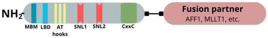 Structure of a KMT2A fusion protein. MBM—menin-binding motif; LBD—LEDGF-binding domain; AT hooks—adenosine–thymidine hook; SNL1, SNL2—subnuclear localization domains; CxxC—cysteine-rich type of zinc finger domain. Image created with Canva Pro https://www.canva.com/pro/ (accessed on 29 January 2024).